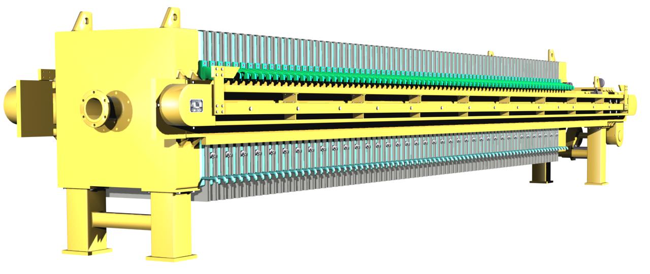 机架部分是机器的主体,用以支撑过滤机构,连接其它部件。它主要由止推板、压紧板、油缸体和主梁等部件组成。机器工作时,油缸体内的活塞推动压紧板,将位于压紧板与止推板之间的滤板、隔膜板、滤布压紧,以保证带有压力的料浆在滤室内进行加压过滤。